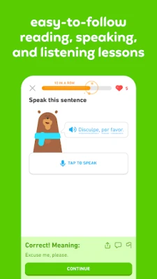 If you like Duolingo, try Super Duolingo for 14 days free! Learn a language fast with no ads, and get fun perks like Unlimited Hearts and Monthly Streak Repair.