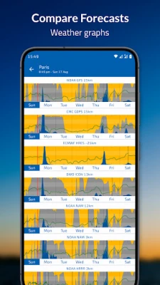 View the week’s weather forecast data at a glance. Choose from a selection of graphs and use the compare function to view all data sources at once.