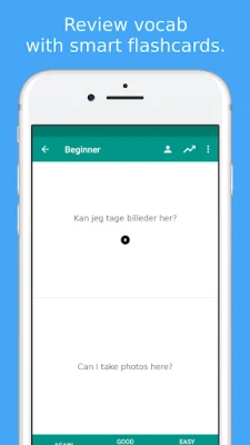 All Danish phrases and words are presented to you in both phonetic and original Danish writing. They are recorded by a native speaker from Denmark.