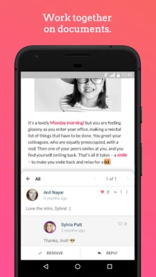 - Join discussions, even when you're away from your desk. Add your thoughts to documents, reply to friends' comments, or just appreciate them by clicking "like." Work together in real-time, with instant sync across your devices.